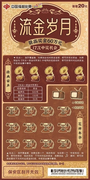 该票面值20元,共有17次中奖机会,最高奖金60万元。共有两个玩法,“经典留声”和“花样年华”两个玩法区内的中奖奖金兼中兼得。