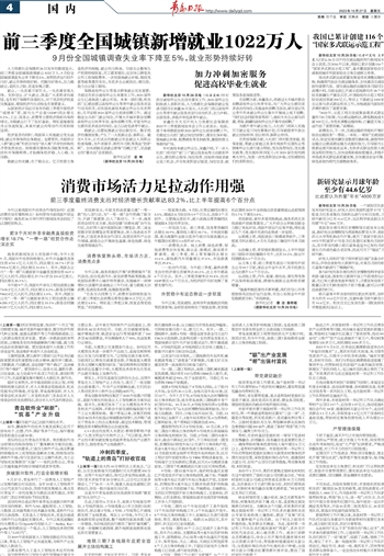 从国家统计局近日发布的前三季度中国经济“成绩单”看,国内生产总值(GDP)同比增长5.2%,工业、服务业、消费等主要经济指标均保持增长,为稳就业打下了良好基础。特别是随着服务业快速恢复,未来对就业的带动作用将持续显现。