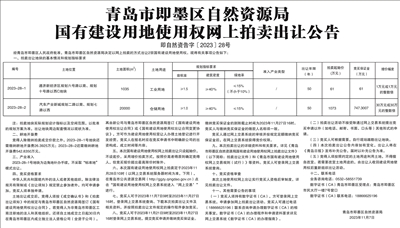 青岛市即墨区自然资源局国有建设用地使用权网上拍卖出让公告