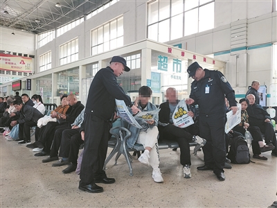 ■平度市公安局凤台派出所民辅警走进辖区汽车站,向群众宣传反诈知识。