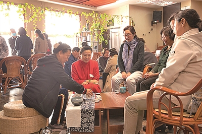 ■青岛高新职业学校老年大学茶艺班教师指导学员行茶。