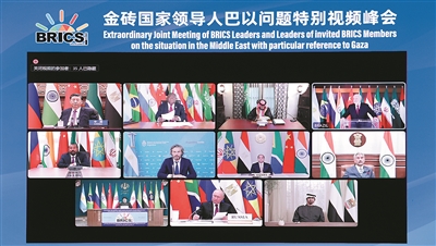 习近平强调,金砖合作机制是新兴市场国家和发展中国家加强团结合作、维护共同利益的重要平台。今天,我们就巴以问题协调立场、采取行动,为扩员后的“大金砖合作”开了个好头。中方愿同其他成员一道,开创金砖合作新时代。