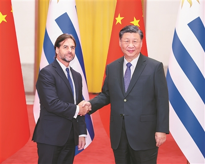 习近平指出,2023年是中乌建交35周年和乌拉圭加入共建“一带一路”倡议5周年。建交35年来,两国始终坚持相互尊重、平等相待、合作共赢,各领域交流合作蓬勃发展。特别是面对新冠疫情,两国守望相助、同心抗疫,中乌战略伙伴关系得到升华。中方愿同乌方一道,以建立全面战略伙伴关系为新起点、新坐标,提升双边关系水平,丰富两国合作内涵,将中乌关系打造成为不同体量、不同制度、不同文化国家团结合作的典范,更好服务各自国家发展,增进两国人民福祉。