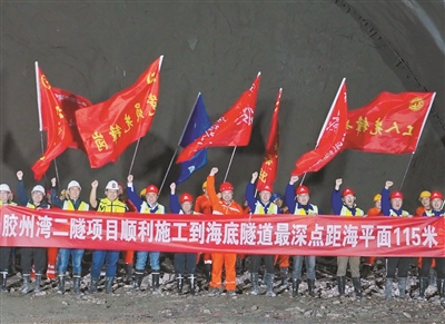 胶州湾第二隧道工程海域段服务隧道掘进至海平面下115米。图为施工人员在现场庆祝。