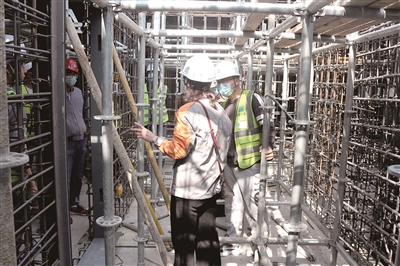 ■市国动办工作人员在项目施工现场检查人防门框施工质量。