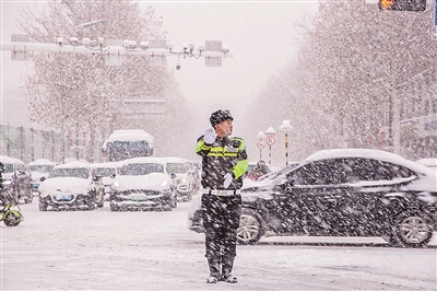 20日,平度交警在风雪中指挥交通。