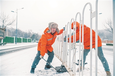 ■20日上午,维修工人冒雪整修汉川路路中央发生移位的隔离护栏。 杨志文 摄