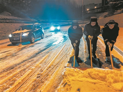 20日凌晨,当很多人还在熟睡之际,城运控股集团65支冬运突击队兵分多路,在场站及始发站周边清扫积雪,同时赶赴沿线重点路段、坡路、弯道等处,抛撒沙土、铲除积雪。还对所属线路客流节点和危险路段开展巡查值守,以便及时掌握线路客流动态和道路通行能力。冬运突击队出击保障线路运行的同时,还为开私家车出行的市民提供便利和帮助。