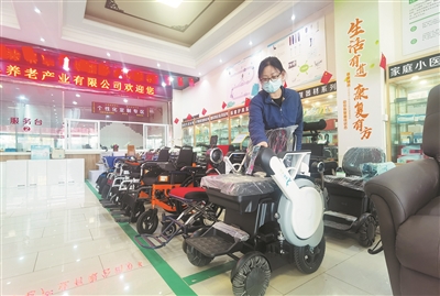 ■青岛惠康辅助器具门店店长孙亚暖向记者展示电动轮椅。 余瑞新 摄