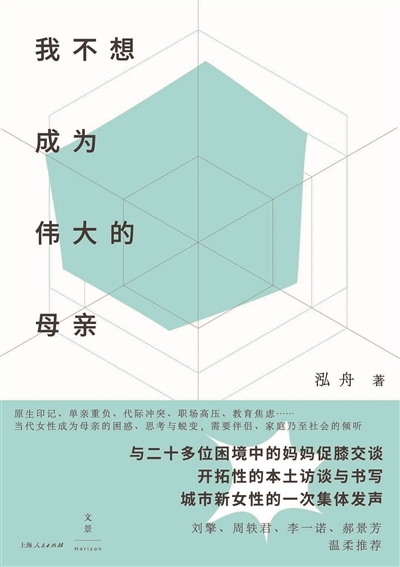 通过访谈,书写者带着切肤之感传达出那些被漠视已久的期待、困顿与挣扎。从具体而微的生活肌理延伸到社会结构与观念的分析,挑战着固化的母职身份与传统的两性关系模式,作为纪录片导演和战地记者的周轶君感叹于作者耐心温柔的体察,在她看来,采访日常,要千倍难于采访战地,而写作者泓舟,展示了母亲们的生命细节,让她们卸下传统母性“伟大”的包袱,在我们的价值体系里、职业生涯设计里和公共育儿制度里寻求为母之艰的症结。