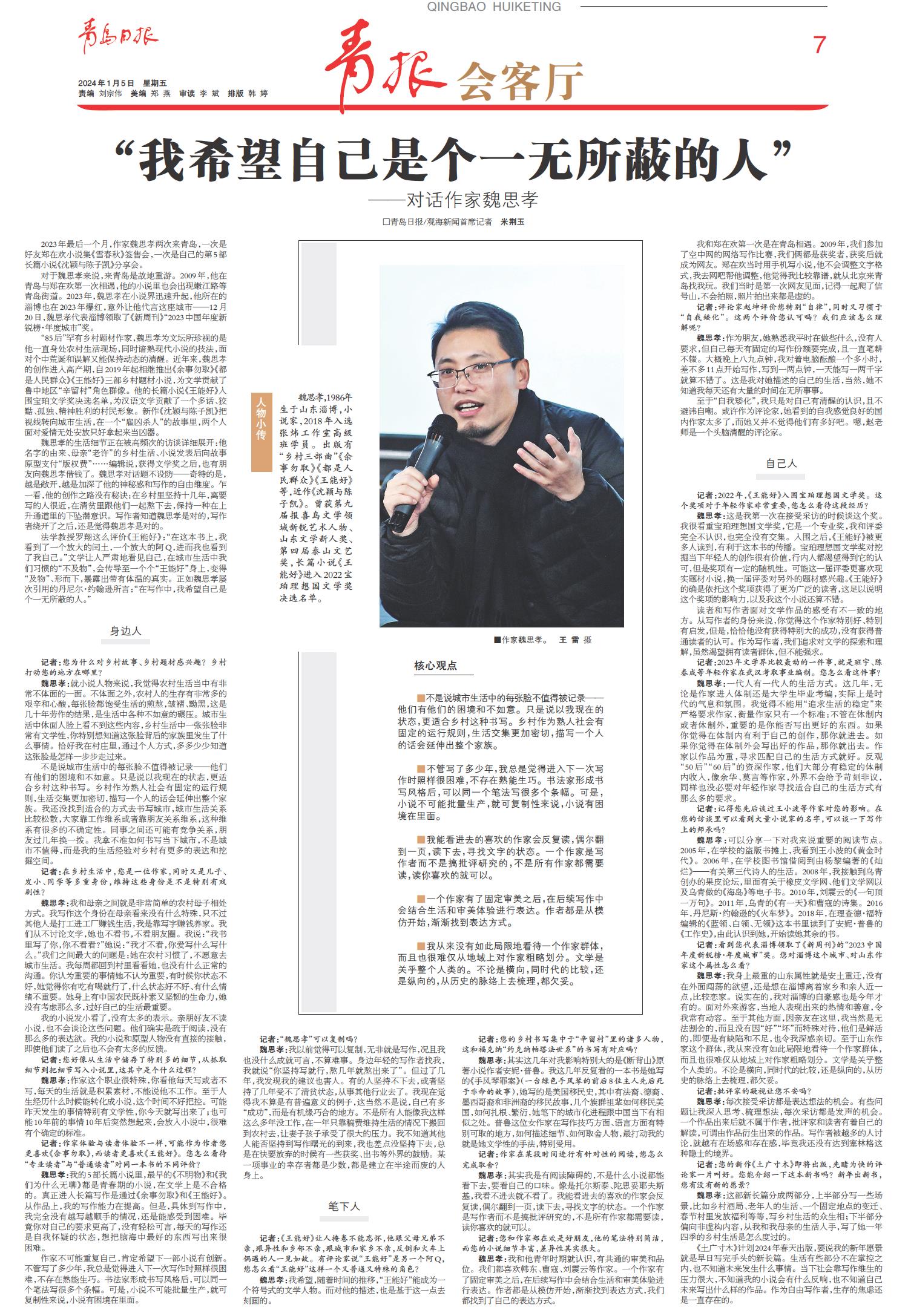 魏思孝:每次接受采访都是表达想法的机会。有些问题让我深入思考、梳理想法,每次采访都是发声的机会。一个作品出来后就不属于作者,批评家和读者有着自己的解读,可谓由作品衍生出来的作品。写作者被越多的人讨论,就越有在场感和存在感,毕竟我还没有达到塞林格这种隐士的境界。