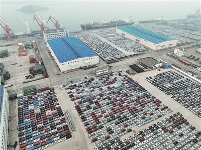 ■1月13日,在江苏连云港港东方港务分公司码头,大批汽车集港准备装船(无人机照片)。 新华社照片