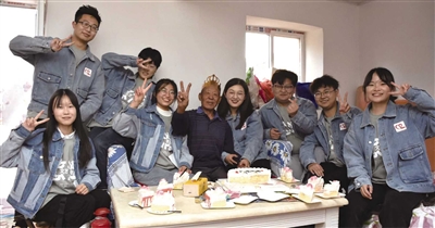 ■崂山区打造困难群众“物质+服务”多维救助服务模式,图为区域内高校大学生志愿者为特困老人庆生,开展亲情陪伴服务。
