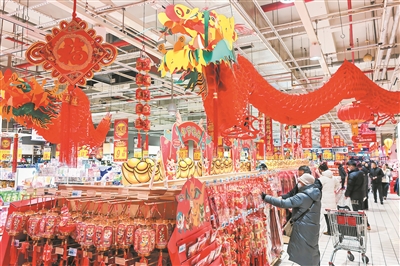 ▲春节临近,卖场内张灯结彩,各种年货琳琅满目,消费者购买热情高涨。 于 滈 摄