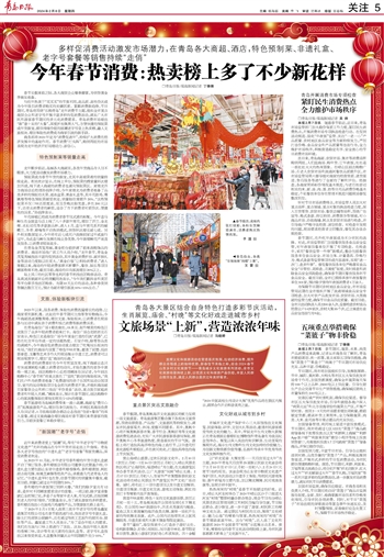 加强促销力度,丰富节日市场。引导企业组织适销对路、品优价廉的“菜篮子”产品,积极拓展销售渠道,开展形式多样的节日促消费活动,为市民提供便捷购物环境。据悉,节日期间,利群、利客来、万福等重点流通企业,将分别开展“祥龙启新岁、红火过大年”“祥龙献瑞过大年”“春节礼购,万福到家”等一系列丰富多彩的促消费活动,进一步激发市场消费潜力,满足市民节日消费需求。