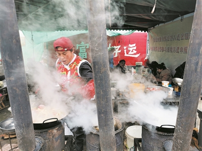 ■泊里大集上的摊主穿着喜庆的花袄,为赶集市民烹饪海鲜烩饼。 赵健鹏 摄