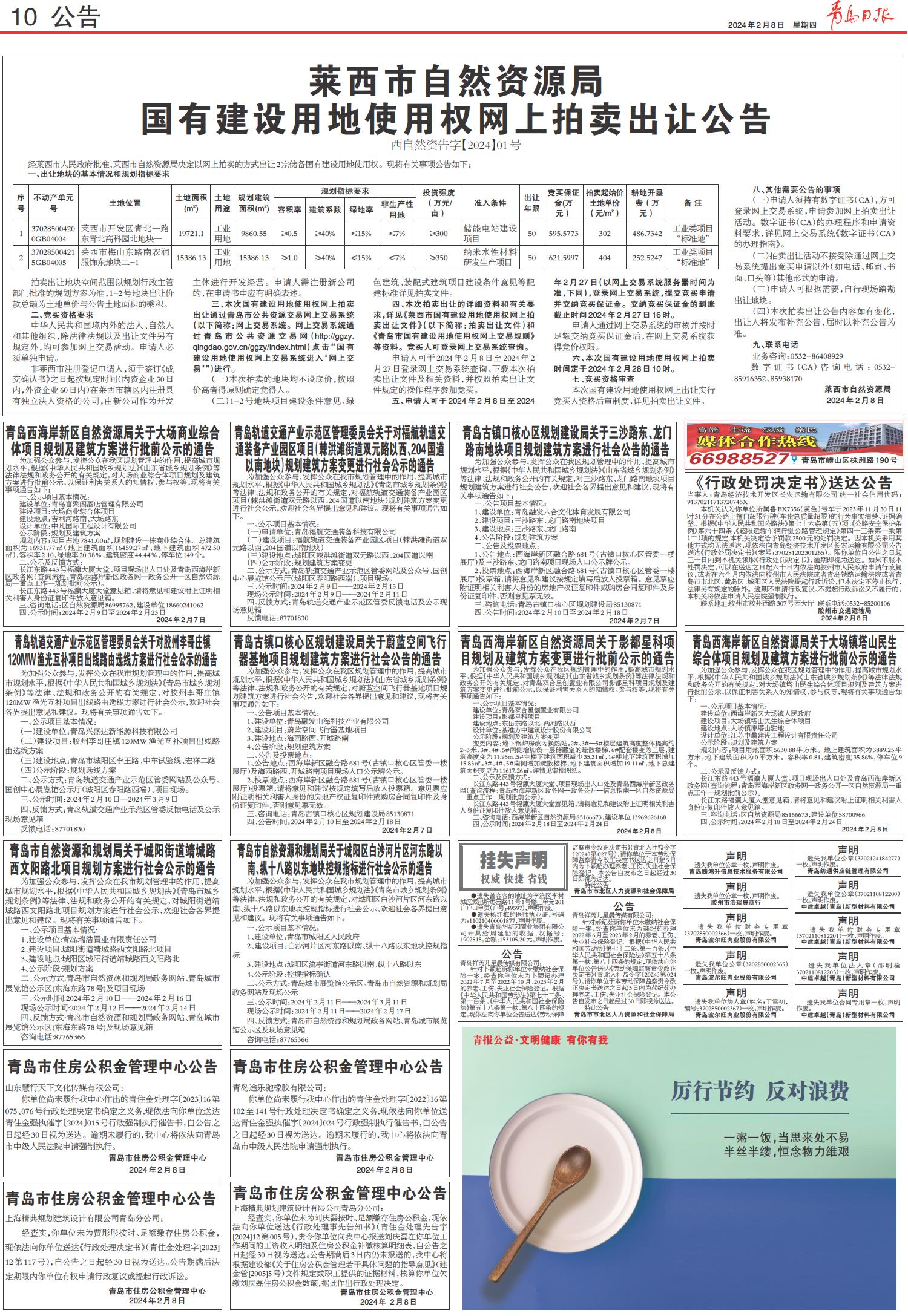 莱西市自然资源局国有建设用地使用权网上拍卖出让公告 青岛西海岸新区自然资源局关于大场商业综合体项目规划及建筑方案进行批前公示的通告 青岛轨道交通产业示范区管理委员会关于对福航轨道交通装备产业园区项目(棘洪滩街道双元路以西、204国道以南地块)规划建筑方案变更进行社会公示的通告 青岛古镇口核心区规划建设局关于三沙路东、龙门路南地块项目规划建筑方案进行社会公告的通告 《行政处罚决定书》送达公告 青岛轨道交通产业示范区管理委员会关于对胶州李哥庄镇120MW渔光互补项目出线路由选线方案进行社会公示的通告 青岛古镇口核心区规划建设局关于蔚蓝空间飞行器基地项目规划建筑方案进行社会公告的通告 青岛西海岸新区自然资源局关于影都星科项目规划及建筑方案变更进行批前公示的通告 青岛西海岸新区自然资源局关于大场镇塔山民生综合体项目规划及建筑方案进行批前公示的通告 青岛市自然资源和规划局关于城阳街道靖城路西文阳路北项目规划方案进行社会公示的通告 青岛市自然资源和规划局关于城阳区白沙河片区河东路以南、纵十八路以东地块控规指标进行社会公示的通告 挂失声明 青岛市住房公积金管理中心公告 青岛市住房公积金管理中心公告 青岛市住房公积金管理中心公告 青岛市住房公积金管理中心公告