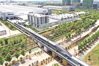 ■在青岛下线的具有完全自主知识产权的我国时速600公里高速磁浮交通系统。