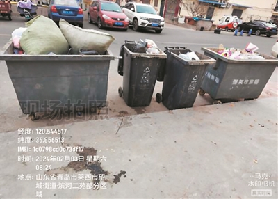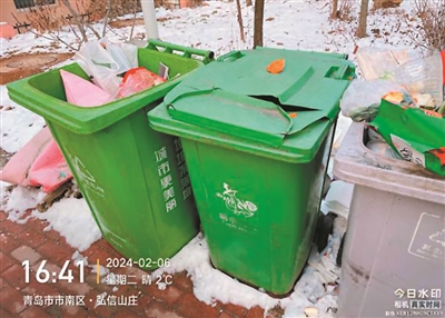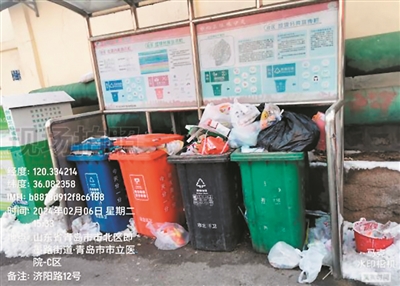 市北区即墨路街道——济阳路12号 ■垃圾桶满溢,桶点周边垃圾落地;厨余垃圾桶、有害垃圾桶混投其他垃圾。