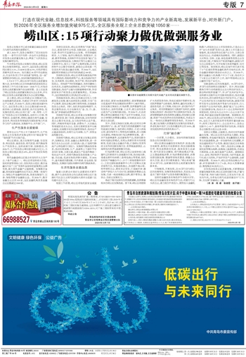崂山区提出金融服务实体经济、制造业数字化转型、新型应用场景谋划、科技创新载体引育、科技成果转化促进、商务服务生态涵育、现代贸易信息赋能、现代物流模式升级、以文塑旅提振消费、时尚消费提质增效、消费场景创新拓展、健康管理体系塑造、增量企业招大引强、重点项目载体建设、“崂山标准”建设15项行动,全面撬动服务业高质量发展的新未来。