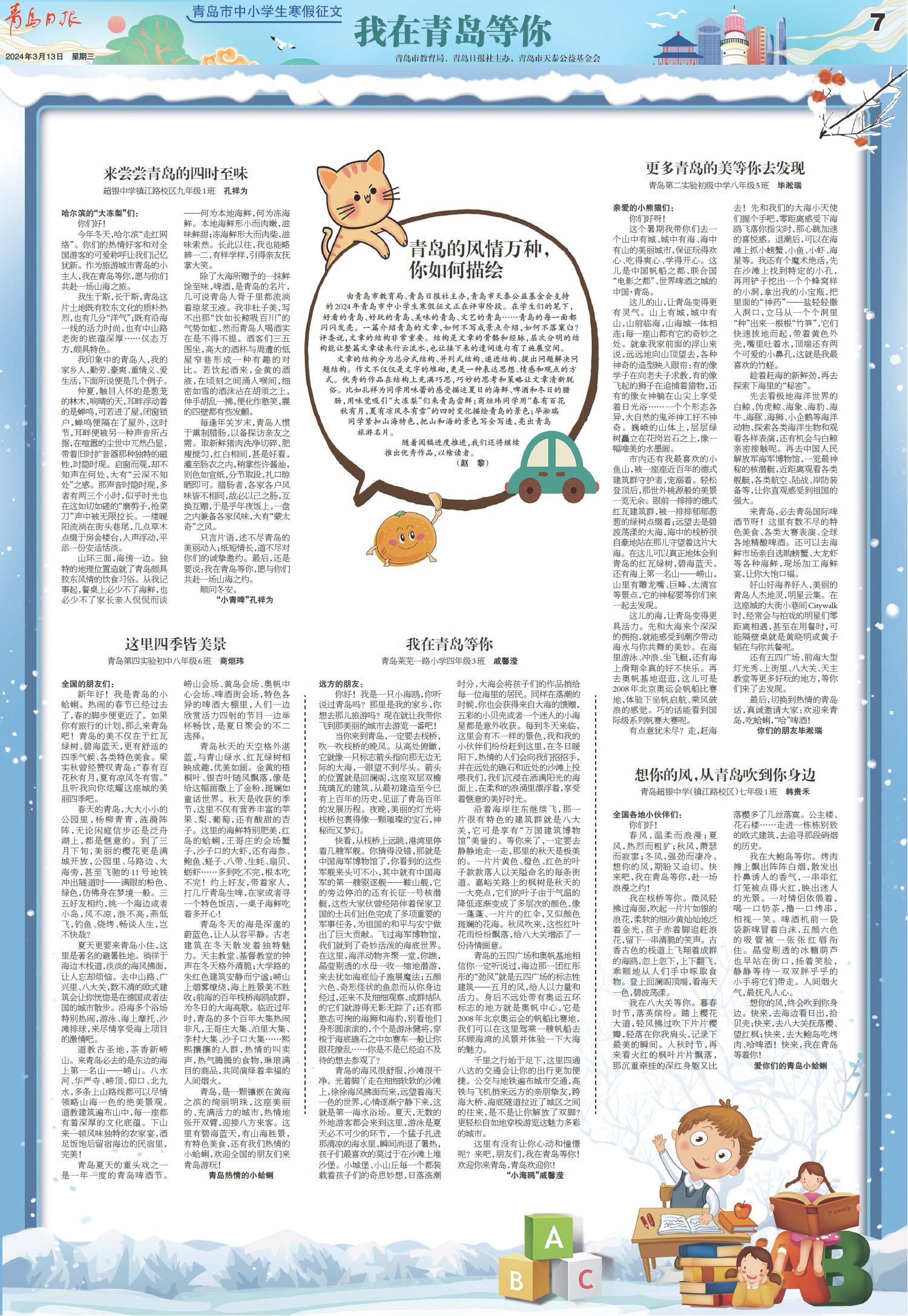 你好!我是一只小海鸥,你听说过青岛吗?那里是我的家乡,你想去那儿旅游吗?现在就让我带你飞到那美丽的城市去游览一番吧!