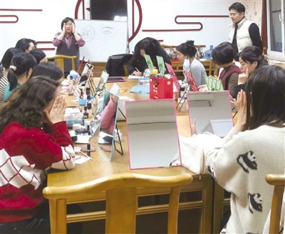 ■青年求职者在市北区“微技能”培训夜校学习美肤化妆、直播电商、花样咖啡等技能。 市北区人社局供图