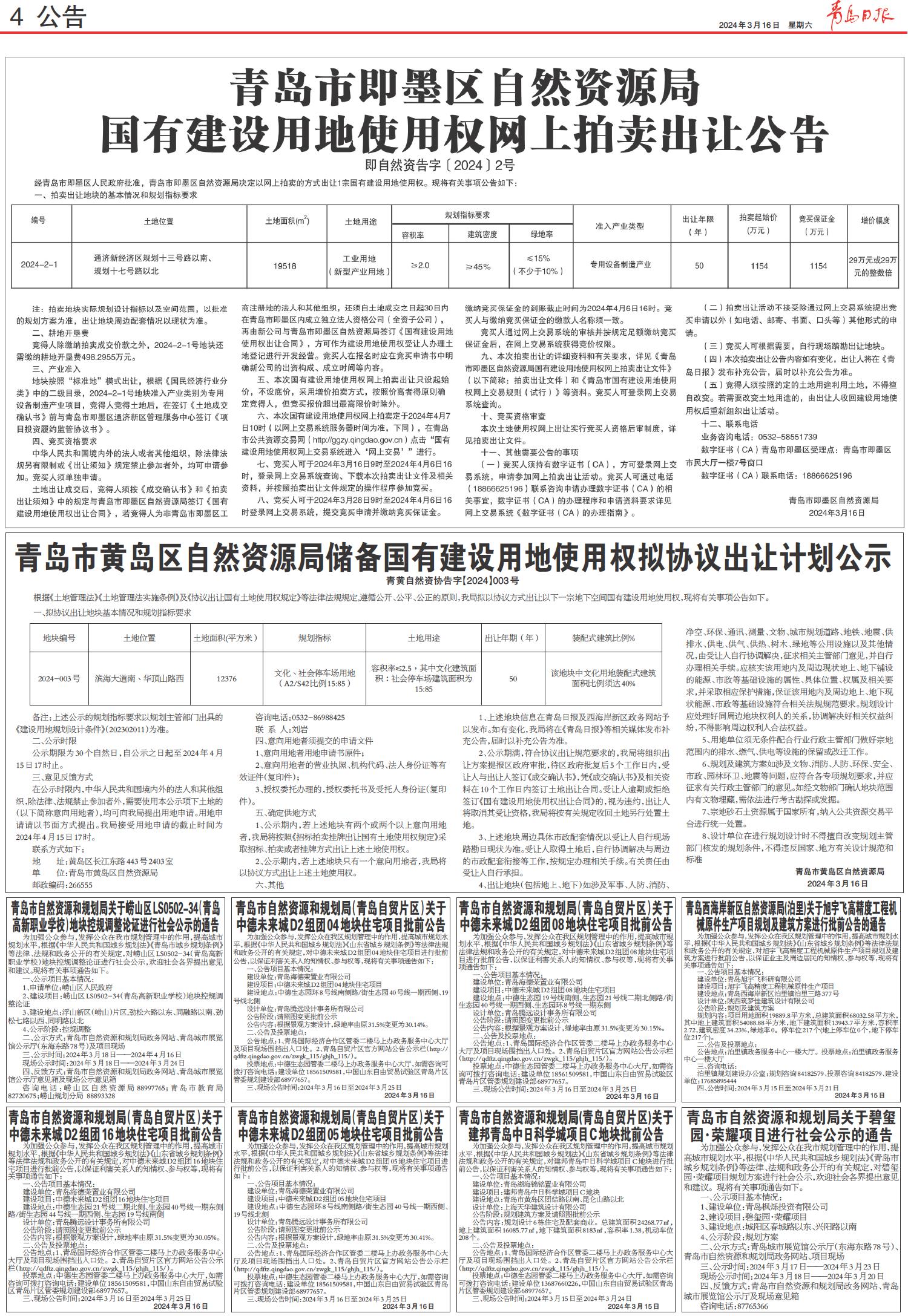 青岛市即墨区自然资源局国有建设用地使用权网上拍卖出让公告