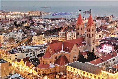 ■夜幕下的圣弥厄尔大教堂区域,烙印青岛的时尚与浪漫。 本版摄影 王 雷