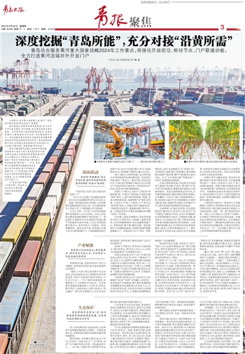 青岛市推进黄河流域生态保护和高质量发展领导小组办公室日前印发《青岛市推动黄河流域生态保护和高质量发展2024年工作要点》(以下简称《工作要点》),绘制了青岛今年服务和融入黄河重大国家战略的“路线图”——今年,青岛将立足发挥黄河流域最佳经济出海口的区位优势,强化开放前沿、枢纽节点、门户联通功能,持续夯实生态保护和高质量发展的基础,全力打造黄河流域对外开放门户。
