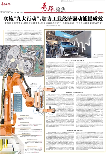 规模以上工业增加值同比增长6.5%左右、战略性新兴产业投资增长15%以上、规模以上工业企业数量突破5000家……市委办公厅、市政府办公厅近日印发《关于加力实施工业经济稳增长强动能提质效年度九大行动的意见》,就2024年青岛工业经济发展展开部署。