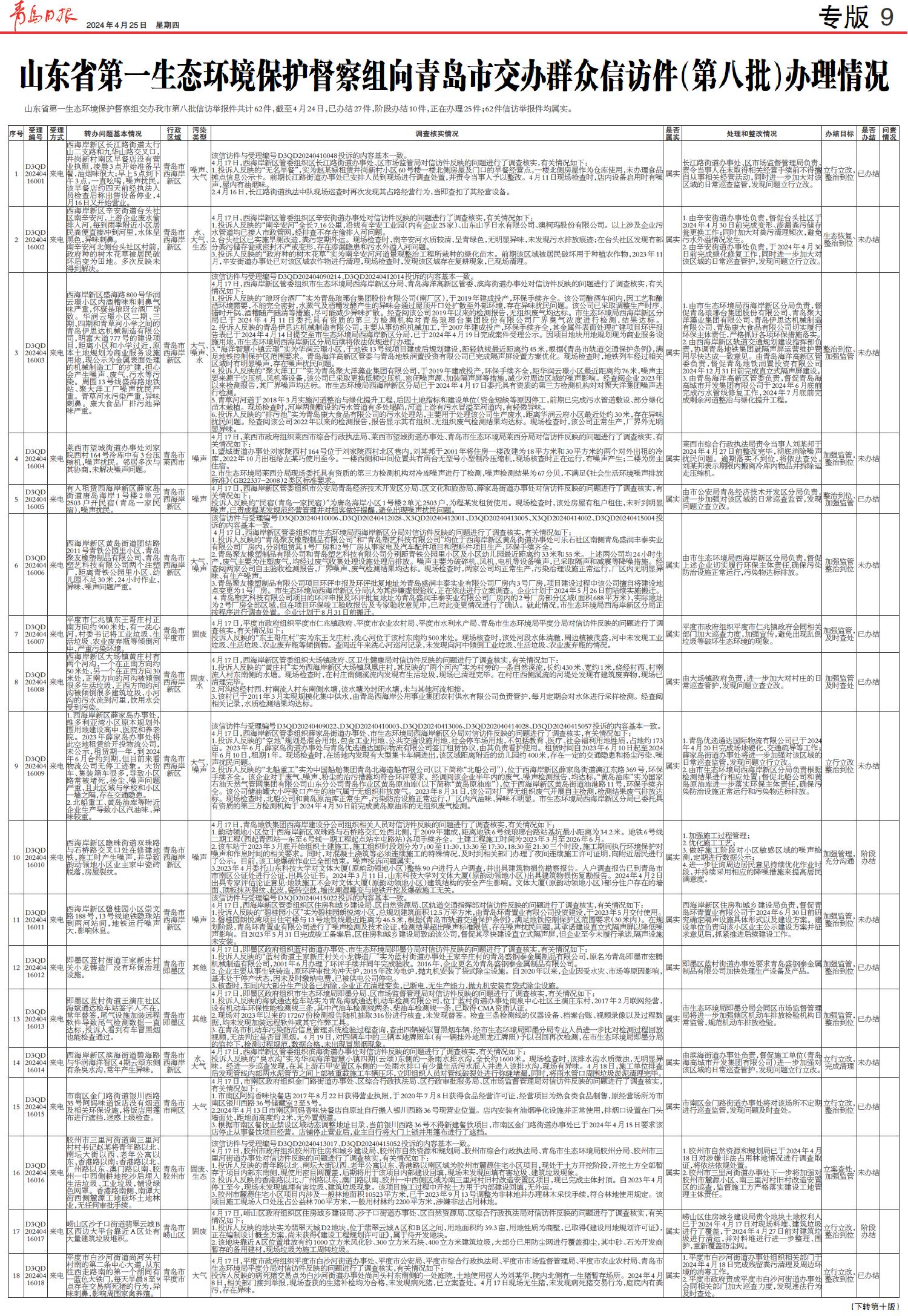 山东省第一生态环境保护督察组向青岛市交办群众信访件(第八批)办理情况