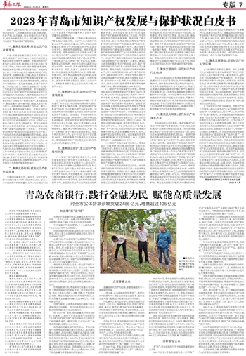 市中级法院在莱西莱阳一体化发展先行区设立“青知创新”服务党代表工作室,为企业家和重点产业链提供精准司法服务。市司法局强化在知识产权方面的专业法律服务力量,全市共有10家律所成为专利代理机构,一批律师事务所经备案成为商标代理机构。市市场监管局(知识产权局)全年共受理专利、商标、国防专利业务19余万笔。国家知识产权局海外知识产权纠纷应对指导青岛分中心为企业提供海外知识产权纠纷维权援助、商标抢注风险预警等服务。“知识产权服务一个平台”成为“数字青岛”成熟运行的公共服务项目。联合知识产权服务机构对19家企业开展知识产权风险“面对面”体检,提供专利确权、用权、维权专业化服务。深入开展知识产权质押融资“入园惠企”行动,助力企业实现“知产”变“资产”,2023年,专利权质押保险贷款服务联盟成员增至50家,66家中小微企业获得贷款2.58亿元;办理商标权质押融资登记18件,金额3.43亿元。市贸促会成立青岛国际商会知识产权服务中心和涉外商事法律专家委员会,为全市企业开拓国际市场保驾护航。青岛海关鼓励引导权利人申请知识产权海关保护备案,省内企业共新增知识产权备案395项,数量居全国第六。金融监管总局青岛监管局持续开展知识产权质押融资线上登记试点工作,截至2023年底,辖区知识产权质押贷款余额9.67亿元。督促引领辖区银行保险机构创新业务模式,截至2023年底,青岛小微企业专利权质押贷款保险帮助842家企业获取贷款19.20亿元。青岛自贸片区构建知识产权全生命周期一体化综合服务平台。成立省内知识产权领域首个海外与中国专家联席工作站。