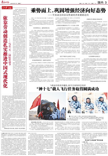 神舟十七号载人飞船于2023年10月26日从酒泉卫星发射中心发射升空,随后与天和核心舱对接形成组合体。3名航天员在轨飞行187天,其间进行了2次出舱活动,配合完成空间站多次货物出舱任务,先后开展了舱内外设备安装、调试、维护维修等各项工作,首次完成在轨航天器舱外设施维修任务,为空间站长期稳定在轨运行积累了宝贵的数据和经验;同时,还在地面科研人员密切配合下,完成了涉及微重力基础物理、空间材料科学、空间生命科学、航天医学、航天技术等领域的大量空间科学实(试)验。