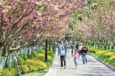 ■太平山绿道两侧的双樱正值盛花期,吸引了不少市民游客前来观赏。得益于太平山中央公园的建设,一条绿道串起中山公园、植物园、动物园和榉林公园四个公园。 于 滈 摄