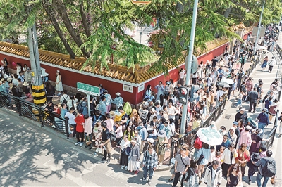 ■“五一”假期,大学路网红墙前人流汹涌。近年来,历史城区的网红景点串点成线,人们在打卡中感受这座城市历史与现代的交融。 于 滈 摄