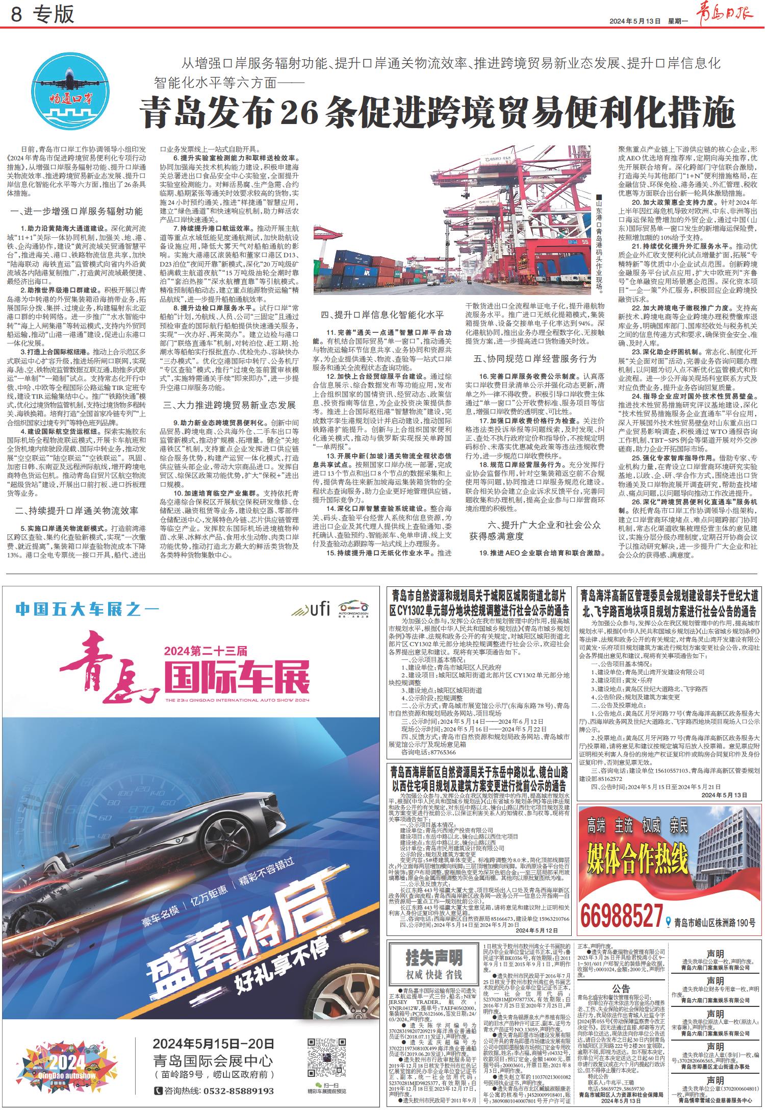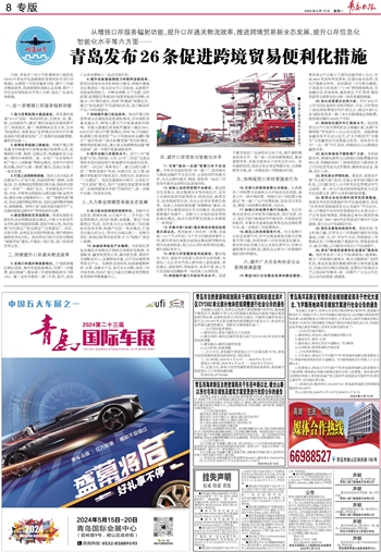 日前,青岛市口岸工作协调领导小组印发《2024年青岛市促进跨境贸易便利化专项行动措施》,从增强口岸服务辐射功能、提升口岸通关物流效率、推进跨境贸易新业态发展、提升口岸信息化智能化水平等六方面,推出了26条具体措施。