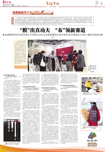 “Surforce表面能量纳米技术和EOS环境适应力技术是我们自主研发的两大核心技术。后者基于科学技术与人体工学,研发在不同的温度、湿度以及微生物的环境中对功能性服装的需求,从而研发‘贴身穿着系统’,改善人体和环境温度差,最大化降低‘湿衣裹身、冰凉刺骨、汗臭扑鼻’等不适的着装体验。”盛雅祺公司总经理助理高玉彩说,目前,应用EOS环境适应力技术而制成的多款新型服装,颇受国内外市场欢迎,公司已与海内外百余家服装品牌达成长期战略合作,年均营收达到2亿元。