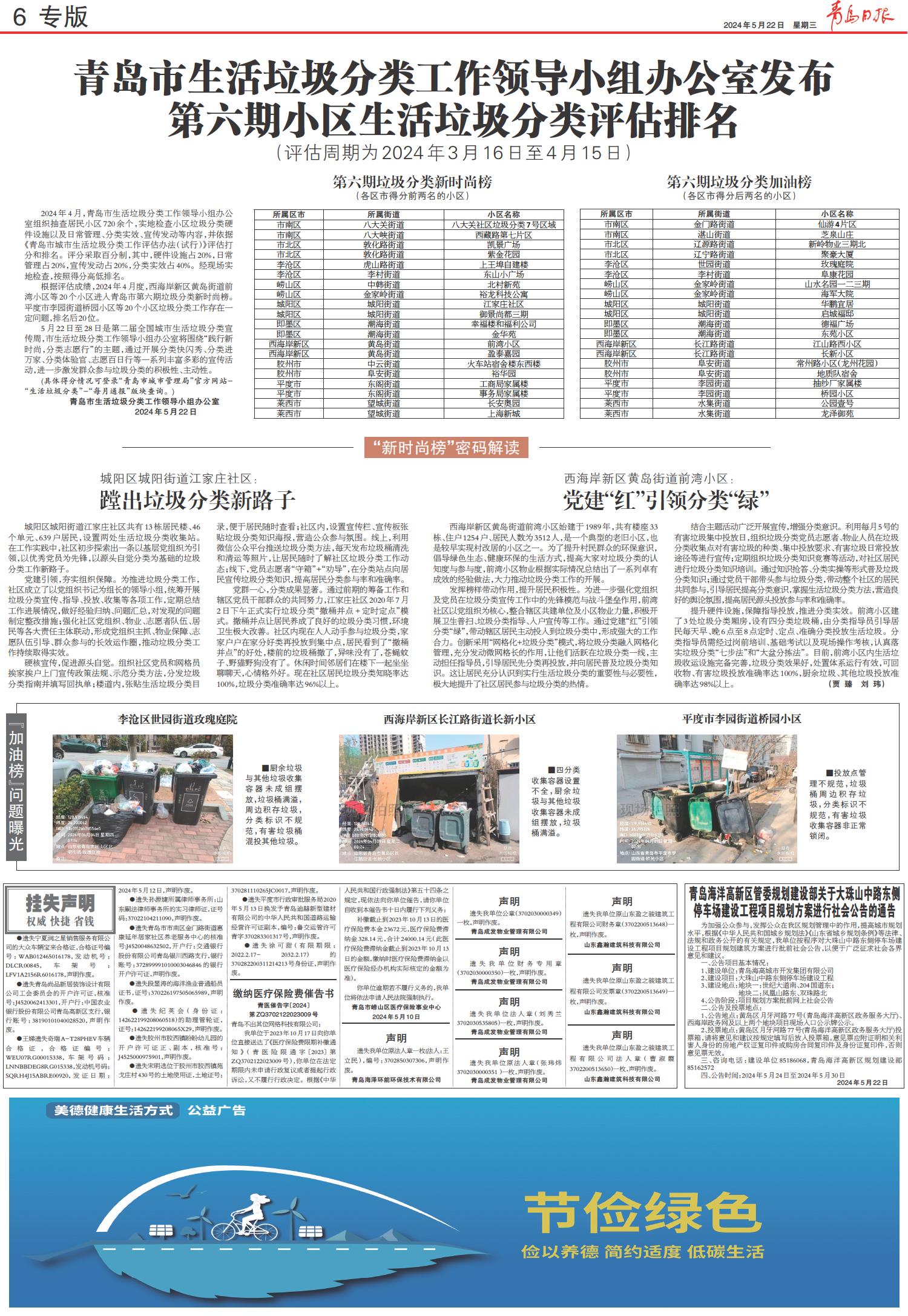 青岛市生活垃圾分类工作领导小组办公室发布第六期小区生活垃圾分类评估排名