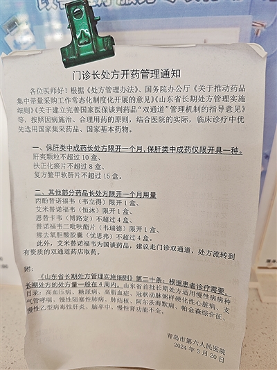 ■青岛市第六人民医院综合服务中心窗口处贴出了“门诊长处方开药管理通知”。