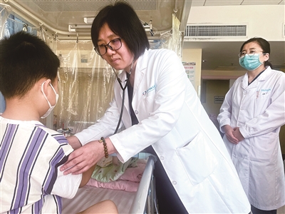 ■梁卉(中)为患儿检查。 黄 飞 摄