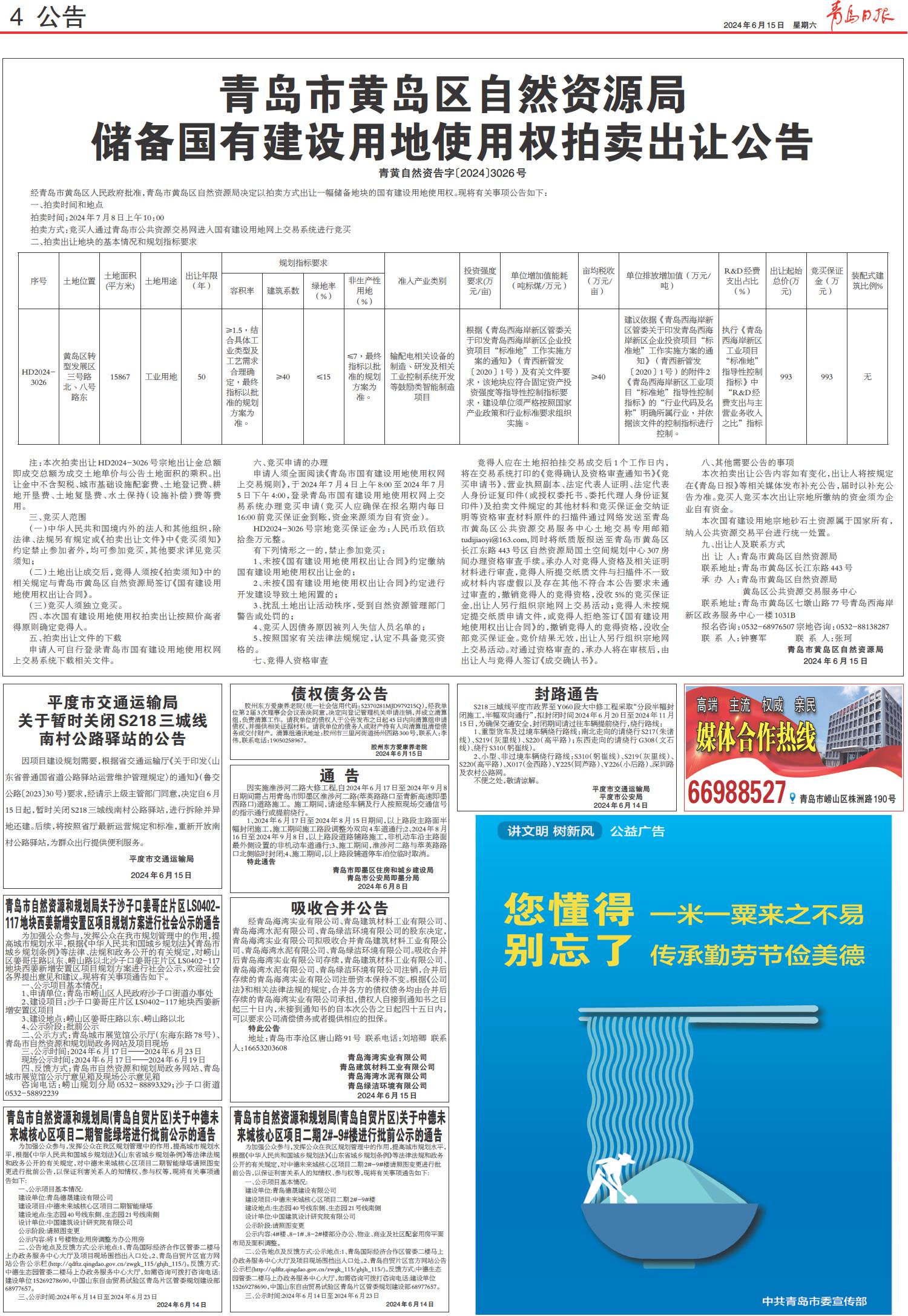青岛市黄岛区自然资源局储备国有建设用地使用权拍卖出让公告