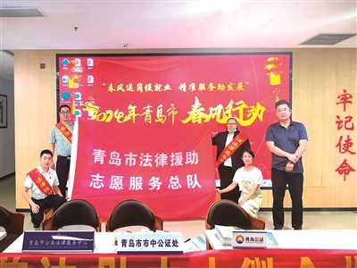 ■日前,青岛市公共法律服务中心法律服务志愿队在青岛人力资源市场开展了主题为“送法进企业 普法促就业”的法治宣传活动。