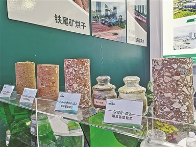 ▲领军集团在展会上展出的大掺量固废路面基层材料取芯样品。