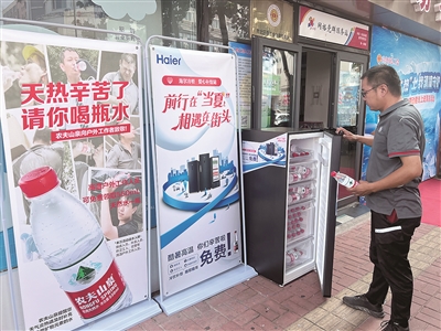 ■快递员在户外劳动者驿站免费领水,清凉度夏。