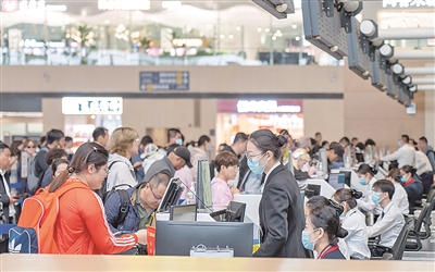 ■青岛机场航站楼内,旅客在办理值机手续。