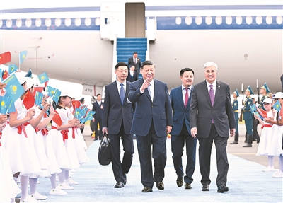托卡耶夫在机场为习近平举行盛大隆重的迎宾仪式。100余名仪仗兵英姿挺拔,军乐团奏响迎宾曲和迎宾号角。近百名哈萨克斯坦儿童挥舞中哈两国国旗,欢呼“您好”,热烈欢迎习近平到访。