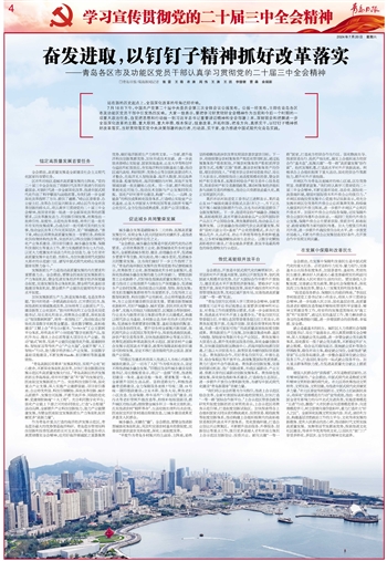 7月18日下午,中国共产党第二十届中央委员会第三次全体会议公报发布。公报一经发布,立即在青岛各区市及功能区党员干部中引发热烈反响。大家一致表示,要把学习好贯彻好全会精神作为当前和今后一个时期的一项重大政治任务,自觉把思想和行动统一到习近平总书记重要讲话精神和全会部署上来,深刻领会和把握进一步全面深化改革的主题、重大原则、重大举措、根本保证,锐意改革、开拓创新,把准方向、真抓实干,以钉钉子精神抓好改革落实,当好贯彻落实党中央决策部署的执行者、行动派、实干家,奋力推进中国式现代化青岛实践。