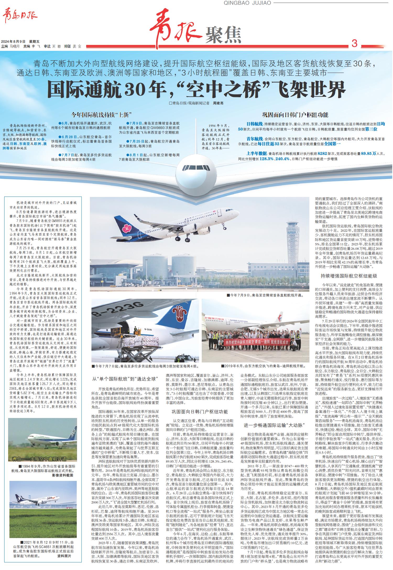 8月恰逢暑期旅游旺季,进出境游热度攀升,青岛国际航空市场“热气腾腾”。