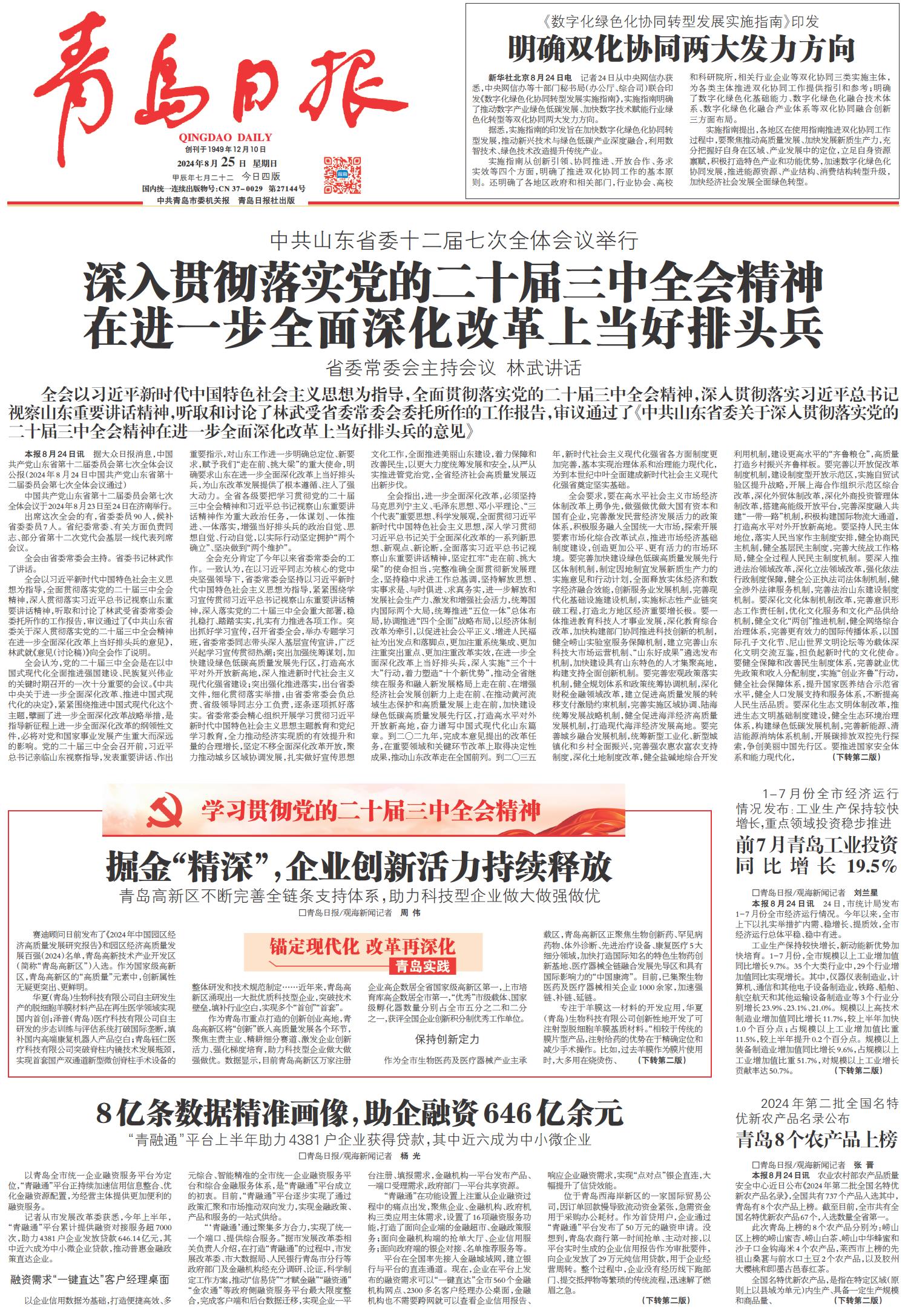深入贯彻落实党的二十届三中全会精神 在进一步全面深化改革上当好排头兵