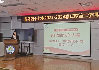■青岛第四十七中学学校校长徐勤引领全校教师阅读。